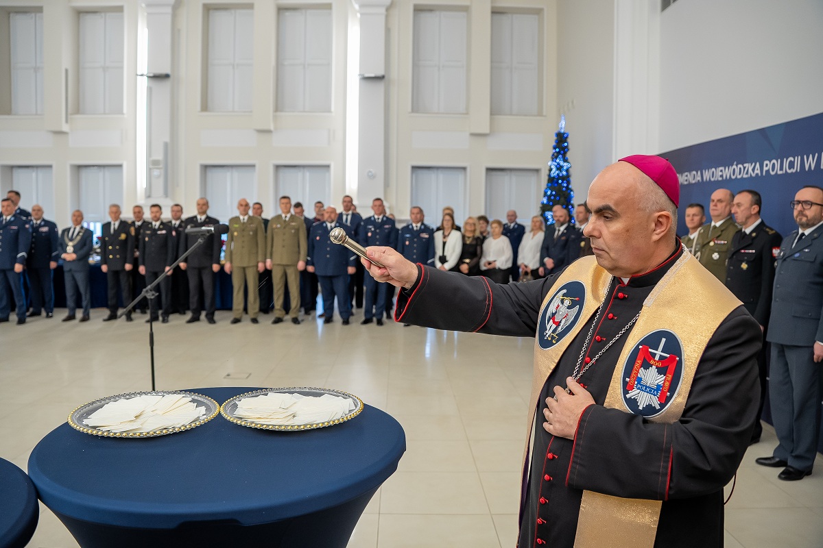 Sala Konferencyjna Komendy Wojewódzkiej Policji w Lublinie była miejscem uroczystego spotkania przedstawicieli służb mundurowych województwa lubelskiego, którzy w radosnej atmosferze łamiąc się opłatkiem złożyli sobie świąteczne życzenia.